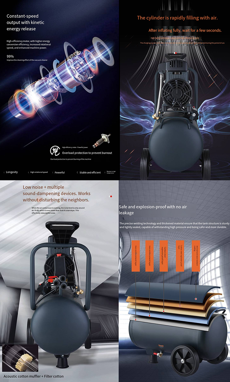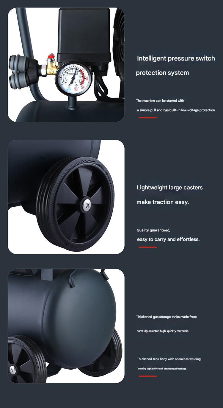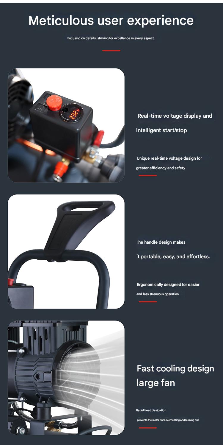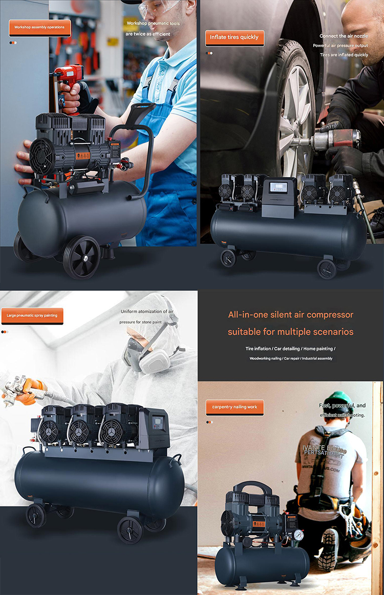 Adecuada para una amplia gama de escenarios industriales y comerciales donde se requiere pureza del aire y suministro de aire flexible, la serie F1200 sobresale en talleres de procesamiento pequeños y medianos, instalaciones de reparación de automóviles y operación de herramientas neumáticas con demanda de aire intermitente. También es ideal para procesos de fabricación ligeros, clínicas dentales y aplicaciones de laboratorio que exigen aire libre de aceite para evitar la contaminación de productos o equipos. Su funcionamiento adaptable lo convierte en una solución práctica de suministro de aire para escenarios de uso de aire tanto intermitente como continuo a corto plazo, equilibrando un rendimiento estable con eficiencia operativa para diversos usuarios.